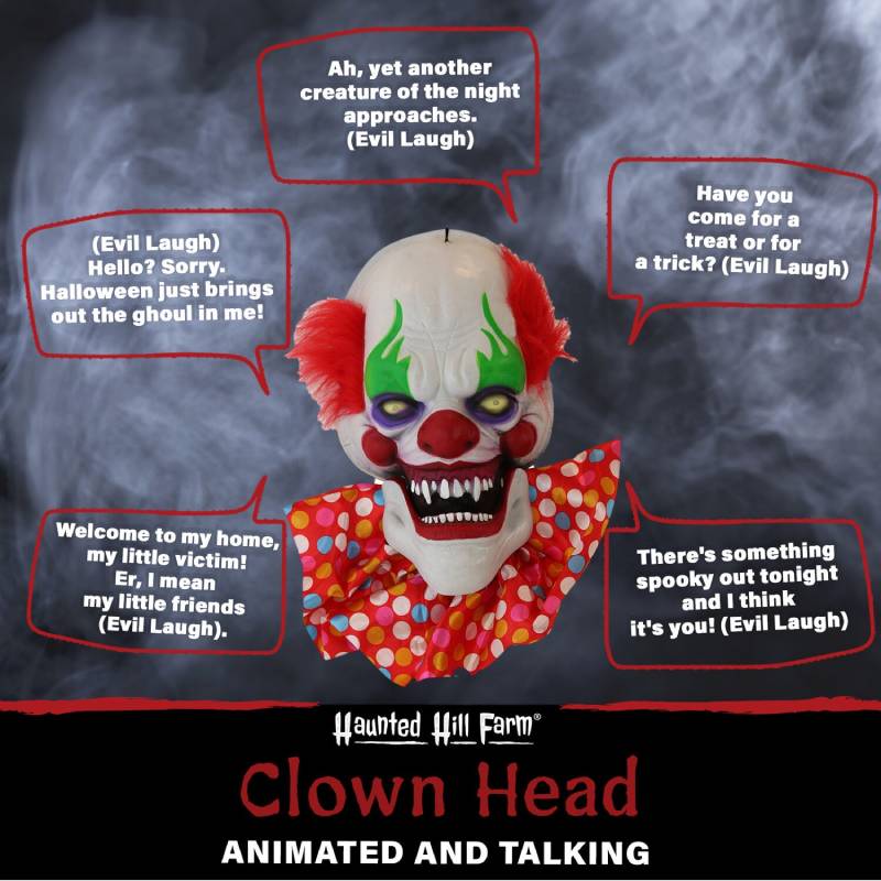 - ANIMATRONIC PROP: Beware! 20-in. clown head for indoor and (covered) outdoor display. Perfectly festive Halloween decor.