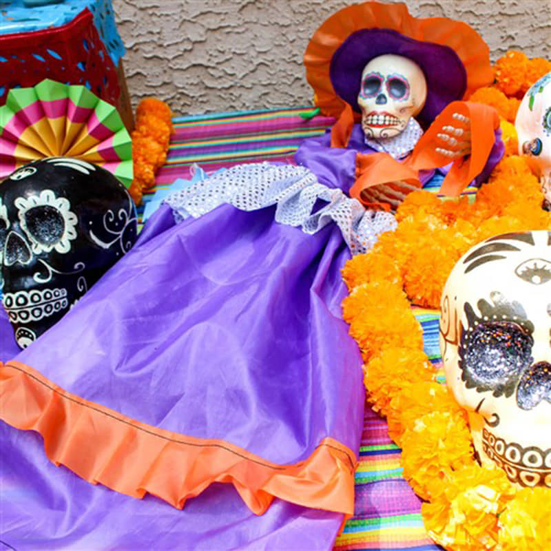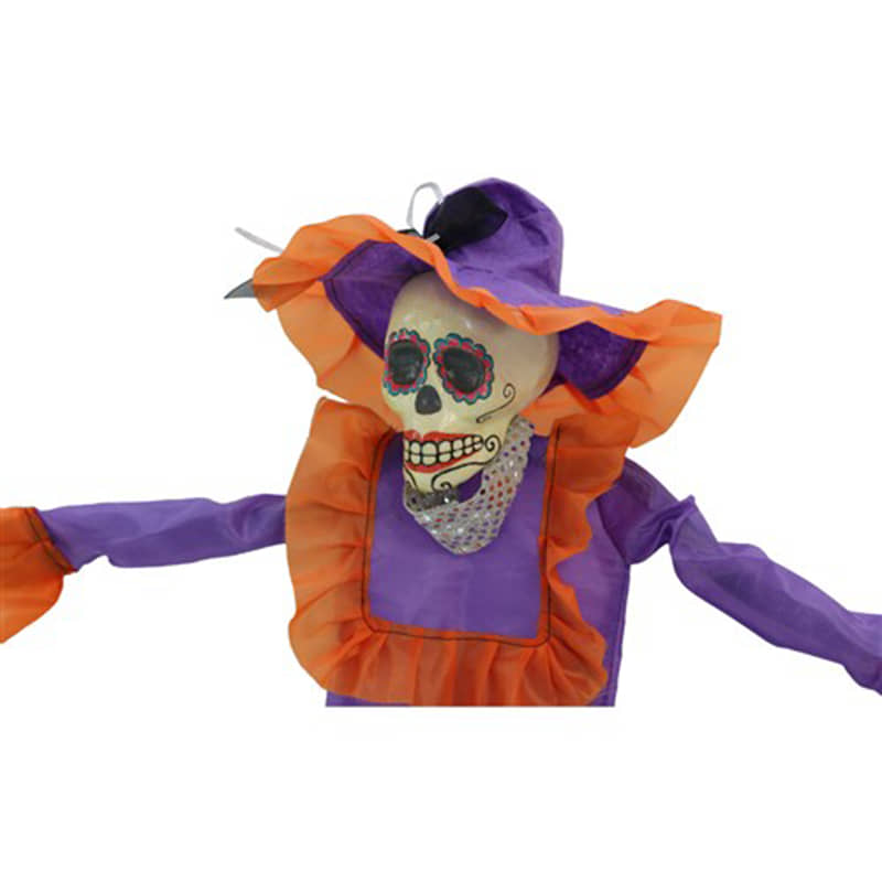 Celebrate and honor the exquisite holiday of Día de Los Muertos with this intricate, sugar-skull-inspired decoration from Haunted Hill Farm. This ornate skeleton bride can be the perfect final addition to any Day of the Dead or Halloween decorations. The vibrant and eye-catching colors of purple, orange, and silver contrast perfectly with the solid off-white of the skull. The bendable arms allow this skeleton to be placed in many positions and comes with a convenient hanging loop. The lightweight and compact features allow the skeleton bride to be placed next to your altar, decorations, or candy dish. Honor this beautiful celebration with a sugar-skull-inspired skeleton from Haunted Hill Farm.