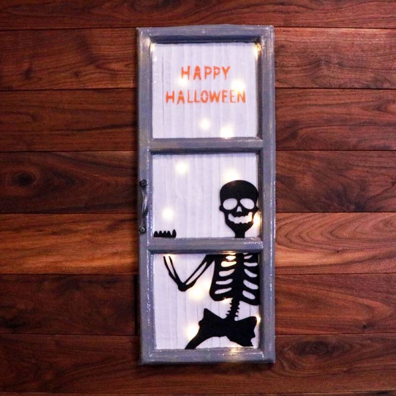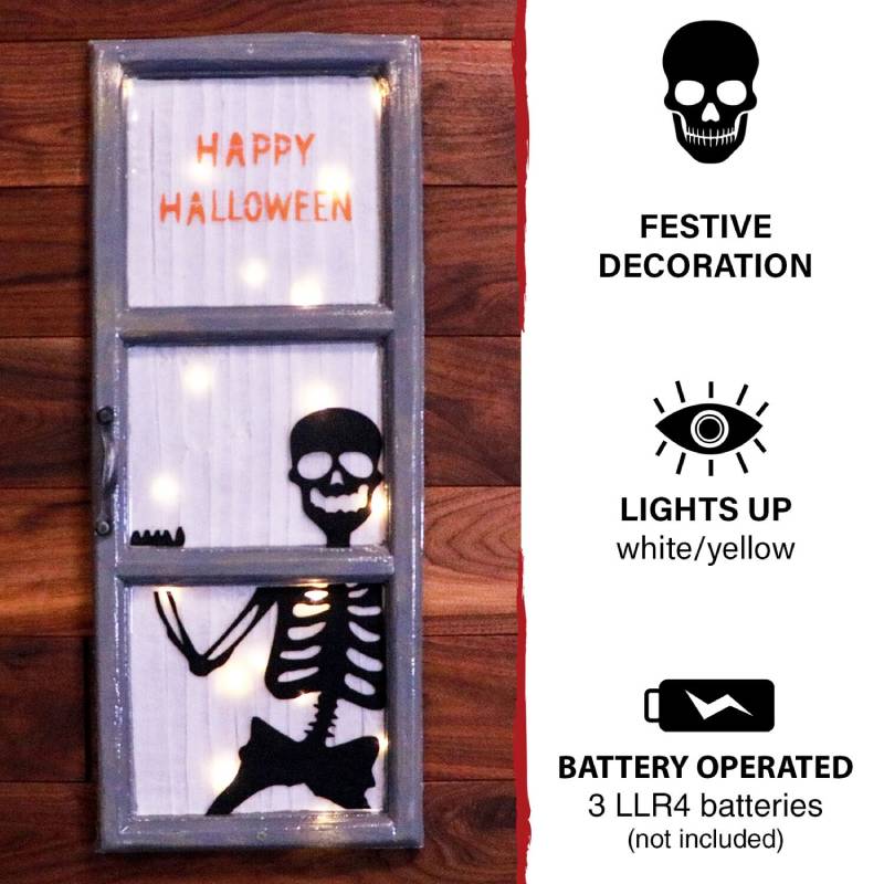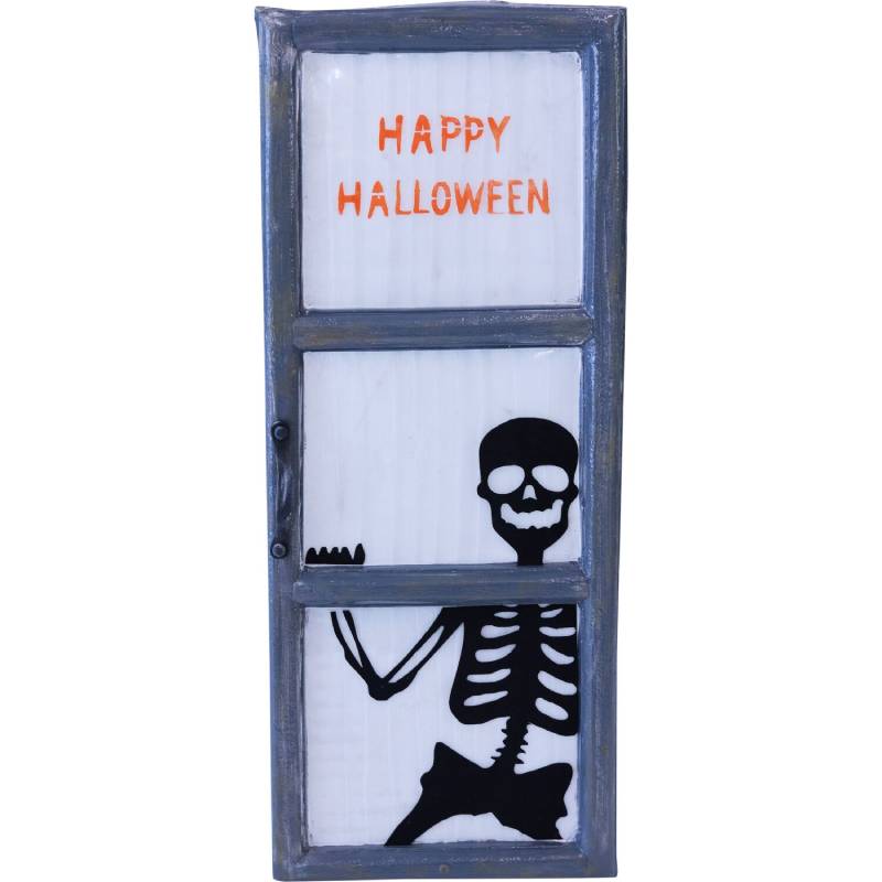 - 27-in. Happy Halloween light-up window with skeleton