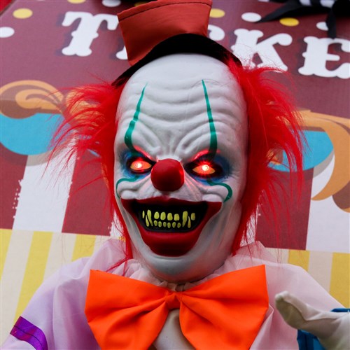 - Circus music and nasal clown voice greets visitors with four frightening phrases