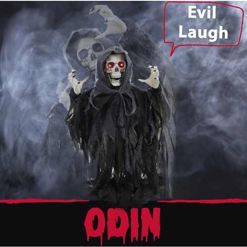 Be afraid. Be very afraid of Haunted Hill’s Pop-Up Groundbreaker Collection. These blood curdling creatures are sure to terrify any trick-or-treaters, co-workers, or customers. If you seek sheer terror this Halloween, look no further. Odin will horrify any visitor who dares cross his path. The reaper’s skeleton arms and head rock back and forth as he cackles into the night. He searches for souls in the darkness, eyes aglow with red light. His frightening looks are intensified by background noises of thunder and haunting screams. His dark hooded figure can be perched next to your treats or hung to petrify victims dusk ‘til dawn. Odin’s wicked open-mouth grin and long black fingernails only add to his already unnerving appearance, and are enough to stop guests in their tracks. Welcome Odin to your home this Halloween, but be warned. He’s out to collect more than just candy.