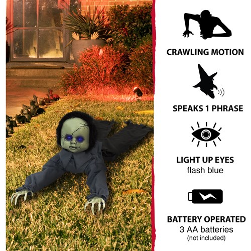Be afraid. Be very afraid of Haunted Hill’s Crawler Collection. These blood curdling creatures are sure to terrify any trick-or-treaters, co-workers, or customers. Alfred the Terrible just wants to have some fun. “Don’t you want to play?” he asks, eyes shining with blue light and evil excitement. Desperate for entertainment, he crawls across the floor and takes unexpected scares room to room. He wriggles his hips to move in close to victims, his cracked baby-doll face and music box melodies chilling visitors to the bone. Alfred’s long skeleton hands stretch outwards. He longs for something–or someone– to grasp. His ripped pants and shaggy black hair add to his creepy appearance. Only the fearless…or foolish…will approach him. “Come closer,” Alfred pleads. “I got a secret.”
