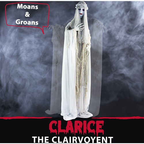 Be afraid! Be very afraid of Haunted Hill’s Broken-Hearted collection. These blood-curdling creatures are sure to terrify any trick-or-treaters, co-workers, or customers. Abandoned at the altar, Clarice, the Clairvoyant, is out for revenge. She can see your future, and if you get too close to her, it isn’t good… Clarice lingers in the night, moaning and moving her arms. Her eyes, streaked beneath with black teardrops, light-up red as she searches for innocent souls. To give her an ideal view, position her on the included stand or suspend her from the hanging loop. No matter where she rests, her foreboding presence will trouble even the bravest trick-or-treaters. One look at her blood-red lips, long gray hair, and sinister expressionless face will stop visitors in their tracks. Her poseable arms end in hands so slender and sharp they resemble talons. Her wedding garments are a haunting reminder of her deep sadness as Clarice pierces the darkness with white. Beware! Don’t let pity make you a fool. That is exactly what Clarice wants.