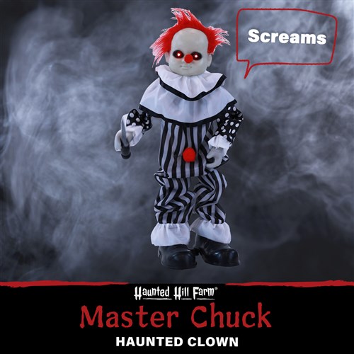 Be afraid. Be very afraid of Haunted Hill Farm’s haunted circus collection. These blood curdling creatures are sure to terrify any trick-or-treaters, co-workers, or customers. Master Chuck the circus clown may be small, but that doesn’t make him any less horrifying than the rest of his creepy friends. His traditional circus outfit gets a spooky twist with black and white patterns accented with blood red splashes of color and ghoulish, hollowed-out eye makeup, making him look risen from the dead. On top of that, red LED bulbs light up his eyes to give them an extra penetrating look in the dark. Touch-activated movements and sounds will startle any guests with jarring screeches and screams. Coulrophobes beware, Master Chuck is waiting to scare.