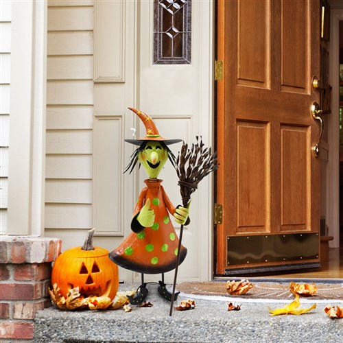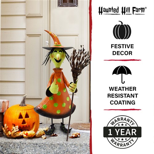 Add a little whimsy to your Halloween decor with a hand-painted Iron Figurine from Haunted Hill Farm. Standing 31 inches tall, this whimsical witch in an orange dress with polka dots holds her broom. Perfect for either indoor or outdoor use, place her on your porch, in your foyer, or next to your fireplace to create a spooktacular holiday display everyone will love. This unique decoration is crafted from high-quality iron, brightly painted, and then finished with a weather-resistant coating that will last season after season. Included is an optional ground stake for lawn or garden use. Count on quality products from Haunted Hill Farm for lots of spooky fun this Halloween season.