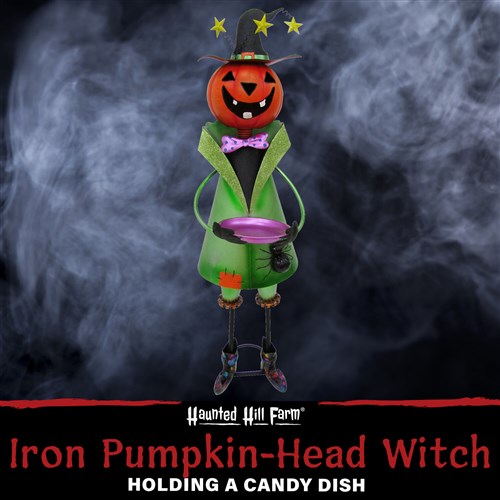 Haunted Hill Farm HHMTWITCH040-0MLT 40″ Iron Pumpkin Head Witch Holding Candy Dish