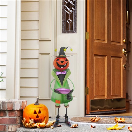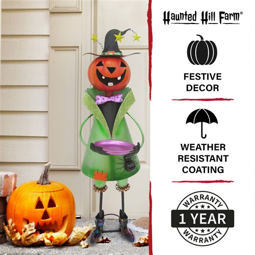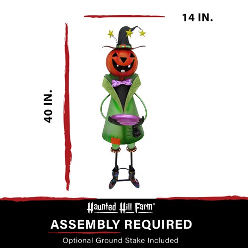 Add a little whimsy to your Halloween decor with a hand-painted Iron Figurine from Haunted Hill Farm. Standing 40 inches tall, this whimsical pumpkin head witch holds a candy dish. Perfect for either indoor or outdoor use, place them on your porch, in your foyer, or next to your fireplace to create a spooktacular holiday display everyone will love. This unique decoration is crafted from high-quality iron, brightly painted, and then finished with a weather-resistant coating that will last season after season. Included is an optional ground stake for lawn or garden use. Count on quality products from Haunted Hill Farm for lots of spooky fun this Halloween season.