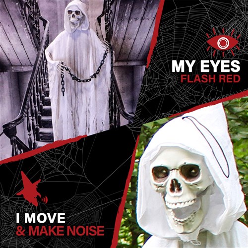 Be afraid. Be very afraid of Haunted Hill Farm’s of Reaper Collection. These blood curdling creatures are sure to terrify any trick-or-treaters, co-workers, or customers. Invite Hallow to your home for a truly undead Halloween. Place the 6.25-ft reaper’s skeleton body on your porch, door-step, or above your bowl of treats to terrify any who dare approach. When visitors get to close, his eyes flash a fearsome red as he releases terrifying roars. Hallow clutches a chain in his ghostly skeleton hands, determined to trap unsuspecting guests. Only the boldest of trick-or-treaters will brave the gruesome ghoul’s sinister smile, monstrous moans, and rocking life-like body. Be warned. Hallow comes hungry, but not for candy…