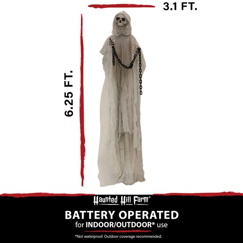 Haunted Hill Farm 75″ Animated Standing Reaper with Chains Features: