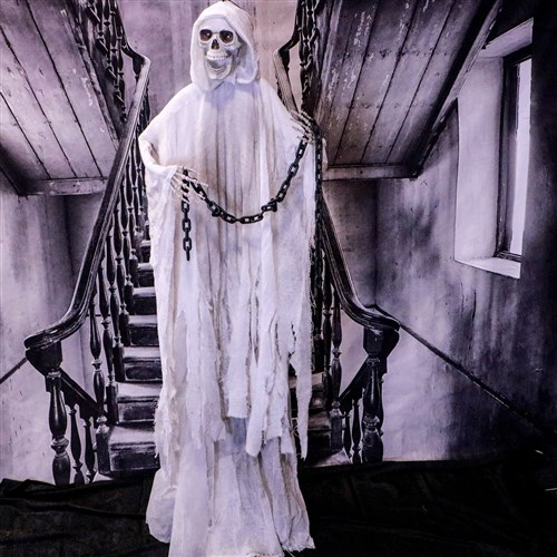 - 6.25-ft. animated reaper with chains for indoor or covered outdoor display