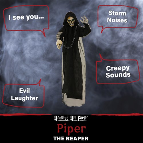 Be afraid! Be very afraid of Haunted Hill Farm’s Reaper Collection. These blood-curdling creatures are sure to terrify any trick-or-treaters, co-workers, or customers. Masked beneath a black cloak, Piper the Reaper blends into the darkness. His haunting laughter and thunder sounds will terrify any passerby. Piper’s eyes illuminate the night with green light, exposing his toothy evil skeleton and wicked gaze. His poseable arms bend into various positions and are complete with alarming, talon-like hands. Piper even carries a souvenir of his past endeavors with him. He clasps a skull and chain in his gruesome grip, flaunting his vicious victories. Keep an eye on Piper as you roam the night because he sees YOU!