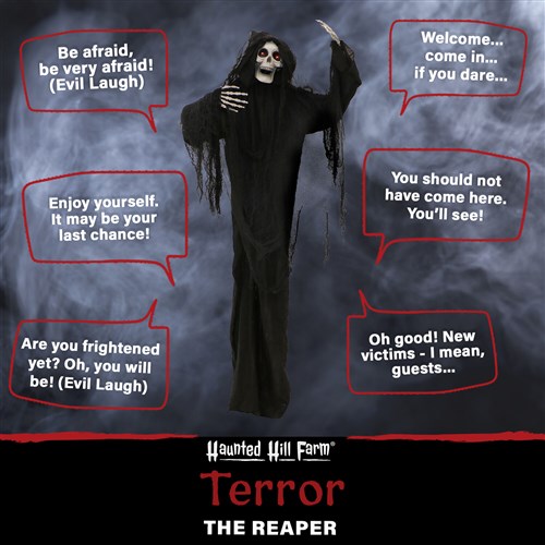 Be afraid. Be very afraid of Haunted Hill Farm’s Reaper Collection. These blood curdling creatures are sure to terrify any trick-or-treaters, co-workers, or customers. Terror the Reaper got his name for a reason. Any who are unfortunate enough to cross this soul-hunting horror are sure to flee in fear. Terror’s mouth moves as he greets victims with ominous warnings— “Enjoy yourself,” he says, “It may be your last chance.” As Terror laughs in wicked delight, his eyes flash red and stormy sounds fill the air around him. Stand Terror at your door or hang him over your treats to ensure only the bravest of visitors stop by. He’ll welcome them to come on in, that is, if they dare..