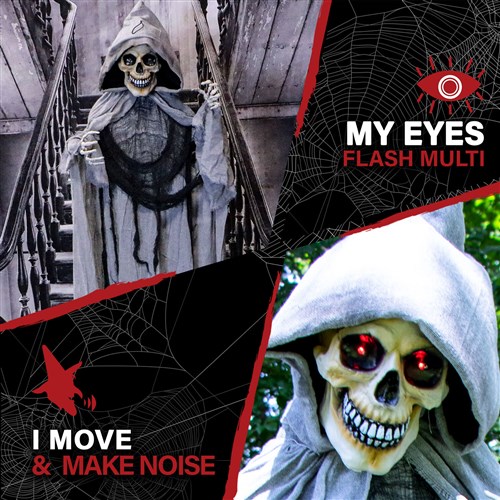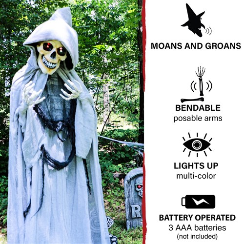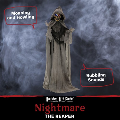 Be afraid. Be very afraid of Haunted Hill Farm’s Reaper Collection. These blood curdling creatures are sure to terrify any trick-or-treaters, co-workers, or customers. Nightmare the Reaper is, well, a nightmare. This terrifying 5-foot beast seeks unsuspecting souls; as he waits, his eyes flash multi-colors, illuminating victims while his moaning, howling, and bubbling sounds warn guests of his gruesome presence. Dressed in a tattered black and gray cloak and still dirt-covered after his trip from below, Nightmare has come hungry this Halloween. Bend his adjustable arms into a variety of haunting positions to keep each scare fresh—he likes it that way. Nightmare can stand at your doorway, hang from your porch, or dangle over your bowl of treats to give visitors a shock they won’t soon forget.