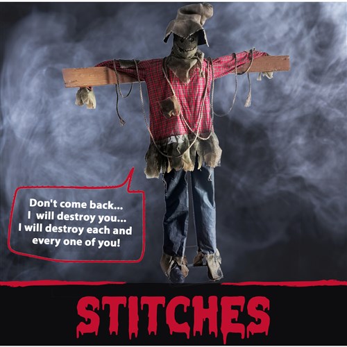 Beware of Stitches from Haunted Hill’s Premiere Halloween Collection. Watch out, Stitches the Scarecrow Zombie will frighten more than just the birds. Many years ago, some children were playing in his cornfield. Suddenly, Stitches came alive and chased them deep into the darkness. Locals attempted to restrain the haunted beast and fastened him tightly to his pole, but when they checked the post in the morning, he had vanished. Stitches wears their limp ropes as a warning… he cannot be contained. As he searches for innocent victims, his eyes flash an ominous red. He greets guests with a deep sinister voice and slowly raises his head to glance at them. Don’t be fooled by his floppy hat, plaid shirt, and slashed burlap grin. Stitches might at first look normal—-friendly, even— but you’ll see a new side of him come nightfall.