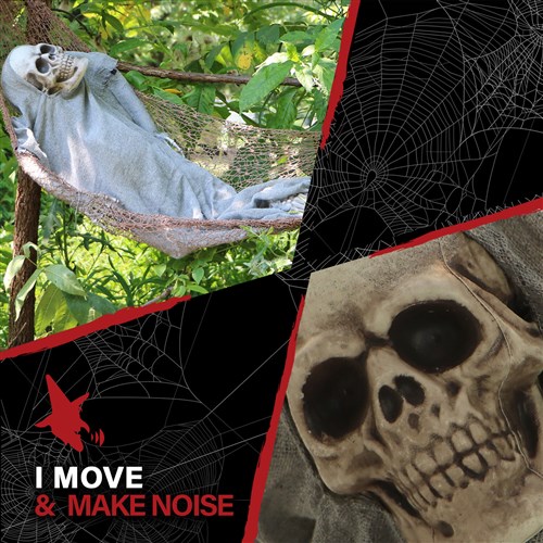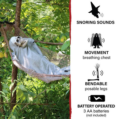 - 3.2-ft animated skeleton snoring in hammock for indoor and covered outdoor display