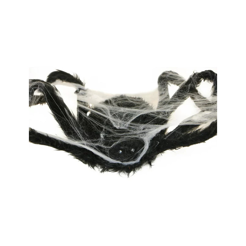- Furry black spider body attached to cobweb.