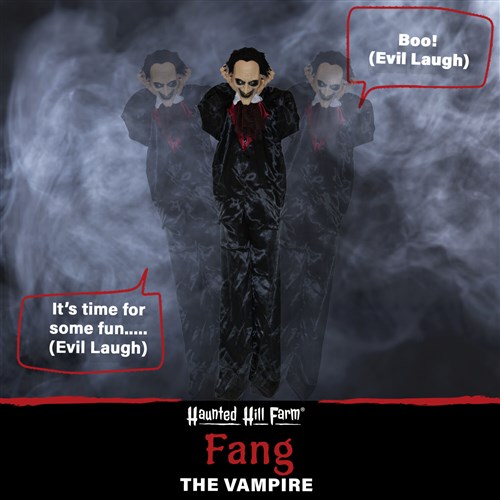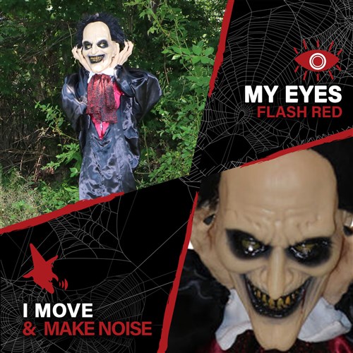 Be afraid. Be very afraid of Haunted Hill Farm’s Lawn of the Dead Collection. These blood curdling creatures are sure to terrify any trick-or-treaters, co-workers, or customers. Invite Fang to your home this Halloween if you dare… he’s particularly… thirsty. When visitors approach this 5.6-ft. vampire, they’ll cower in fear as his eyes flash red and head shakes with delight. Fang releases wicked laughter into the night while he greets his dinner- I mean guests- with crashing sounds and startling “BOO!”s. His appearance alone is enough to horrify onlookers; Fang’s head is complete with spiky black hair, his yellowing eyes are surrounded by darkness, and his smile, exposing his bright yellow teeth, is rimmed with blood. Stand the vicious vampire next to your holiday treats or hang him from your porch for the ideal scare position. Like Fang says, it’s time for some fun…