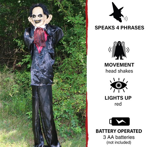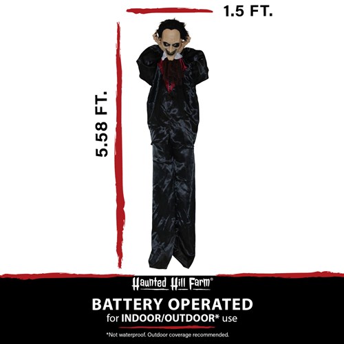 - 5.6-ft. standing animated vampire for indoor or covered outdoor display