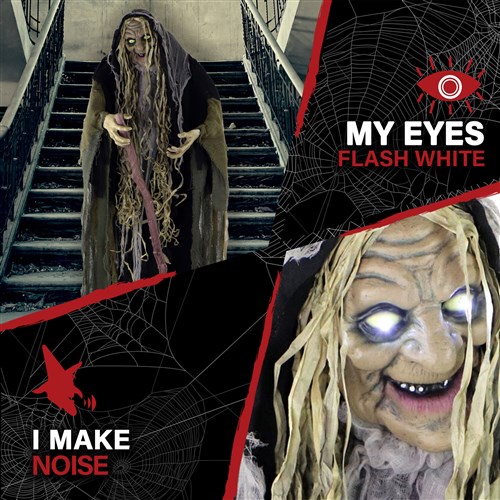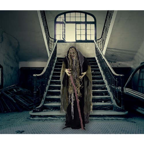 - 68-in. animatronic witch with a staff for indoor and covered outdoor display