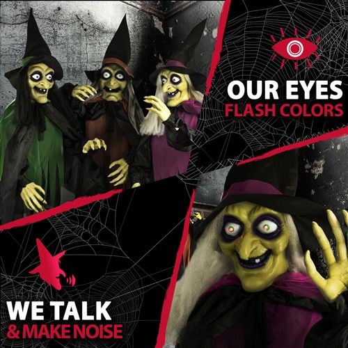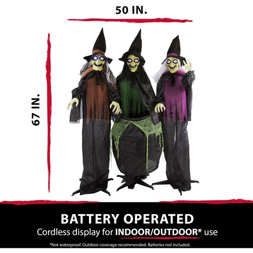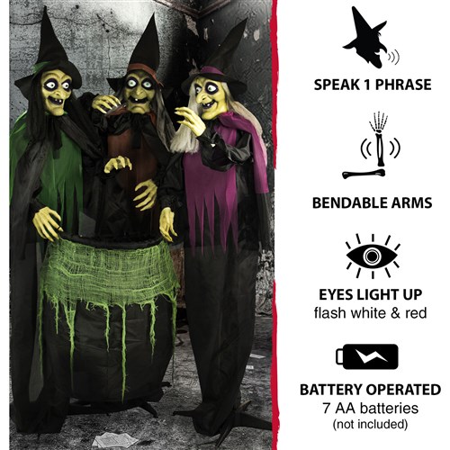 Haunted Hill Farm 3 Animated Standing Witches with Cauldron Features: