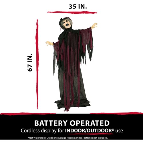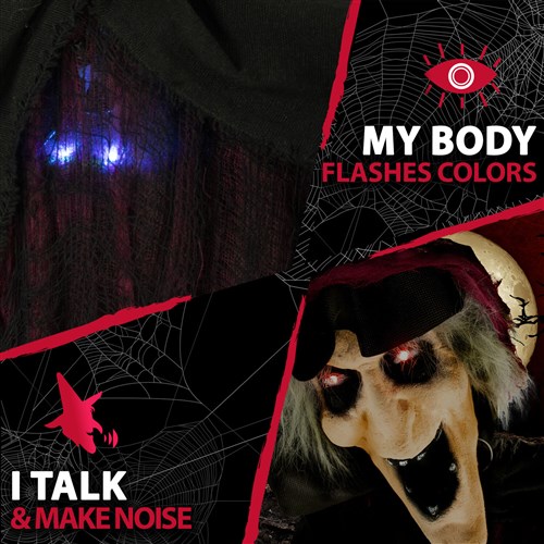 Be afraid. Be very afraid of Haunted Hill’s Curses and Cauldrons Collection. These blood curdling creatures are sure to terrify any trick-or-treaters, co-workers, or customers. Ruth the Ruthless witch is, well…ruthless. The cackling hag mocks visitors as her eyes and life-size body light up an alarming array of colors. Her head and arms move eerily, making the evil witch all the more menacing. Even in the daylight, Ruth’s ghastly appearance is frightening. Her black mouth hangs open in a sinister laugh, exposing her few scattered teeth. Her messy gray hair peeks out from her cobweb covered witch hat and her body is draped in dark tattered robes. Ruth’s arms bend into a variety of scary positions and are finished with realistic hands and black fingernails. If you approach her, don’t expect her advice to be kind. “Eat well and stay fit,” Ruth says. “You’ll die anyway, but at least you’ll look better!