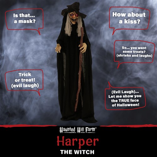 Be afraid! Be very afraid of Haunted Hill Farm’s Curses and Cauldrons Collection. These blood-curdling creatures are sure to terrify any trick-or-treaters, co-workers, or customers. Harper, the witch, is eager to greet your guests this Halloween. She laughs as she taunts each passerby and her eyes flash a fearsome red as she shrieks. Let me show you the true face of Halloween, she croons. I wouldn’t let her. This horrifying hag wears a black cloak and a pointed witch hat while holding a cane in her pale hands. Harper’s piercing blue eyes, mouth lacking several teeth, and gnarled skin will make her stand out from your porch, at your doorstep, or on your walkway. Suspend this wicked witch from her hanging loop, stand her at your driveway, and bend her arms into various haunting positions for the perfect scare each night. Invite Harper to your home, and she promises a bewitching Halloween. She doesn’t promise to be nice, though!