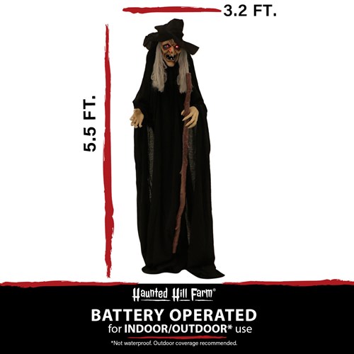 Haunted Hill Farm 66″ Standing Animated Witch with Cane Features:
