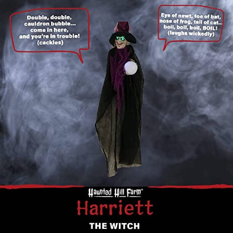 The Haunted Hill Farm HHWITCH-30HLS is a Halloween Animatronics. Be afraid. Be very afraid of Haunted Hill Farm’s Curses and Cauldrons Collection. These blood curdling creatures are sure to terrify any trick-or-treaters, co-workers, or customers. Harriet the Witch would love nothing more than to tell your fortune this Hallowed. The terrifying hag clutches a flashing, multi-color crystal ball in her skeleton-like hands and gazes upon her visitors with light-up, gruesome green eyes. She releases terrifying cackles into the night for all to hear, and if guests get close enough to her, they’ll hear her muttering spells into the darkness. Hang Harriet from your porch, in your doorway, or above a bowl of candy to haunt trick-or-treaters from above. If they hesitate to approach, Harriet’s arms can be bent into a variety of positions to beckon victims closer. But they can’t claim they weren’t warned. After all, Harriet does say, come in here and you’re in trouble