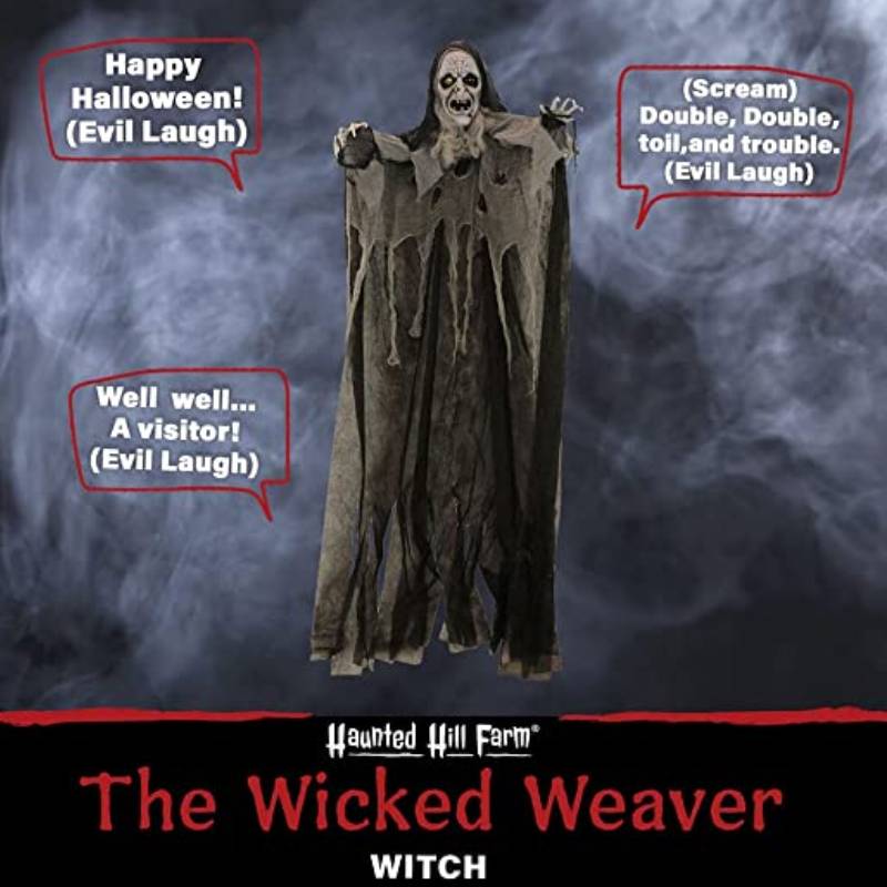 The Haunted Hill Farm HHWITCH-31FLS is a Halloween Animatronics. Be afraid. Be very afraid of Haunted Hill Farm’s Curses and Cauldrons Collection. These blood curdling creatures are sure to terrify any trick-or-treaters, co-workers, or customers. The Wicked Weaver is, well wicked. The cackling hag mocks visitors as her eyes light up an alarming array of colors. Even in the daylight, the Wicked Weaver’s ghastly appearance is frightening. Her black mouth hangs open in a sinister laugh, exposing her few scattered teeth. Her messy gray hair peeks out from her tattered hood and her body is draped in dark robes. The Wicked Weaver’s arms bend into a variety of scary positions and are finished with realistic hands and black fingernails. If you approach her, you can expect a spell to be cast on you. “Double, double, toil and trouble!”, The Wicked Weaver says… Be the spook of the town this Halloween with Haunted Hill Farm!