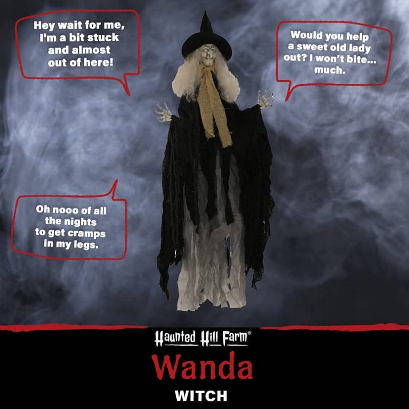 The Haunted Hill Farm HHWITCH-33HLSA is a Halloween Animatronics. If you invite Wanda to your home this Halloween, she promises not to bite. much. This wicked witch will send visitors running for the hills when the see her flashing red eyes, moving arms, gnarled white skin, sharp skeleton hands, and toothy, evil smile. “Hey, wait for me,” she’ll cackle as they flee, “I’m a bit stuck, and almost out of here. ” Wanda will try all night long to lure trick-or-treaters, convincing them she’s just a sweet old lady. But it doesn’t take long to see the horrifying hag is anything but. She just can’t help but burst into bouts of wicked laughter, delighted by the holiday of fear. Get ready, because Wanda is prepared to make this the most bewitched Halloween yet.
