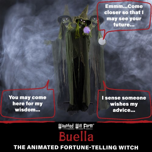 - Buella and her multi-color LED magic ball emits mystical sounds while she reads your fortune on Halloween night