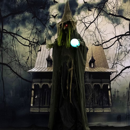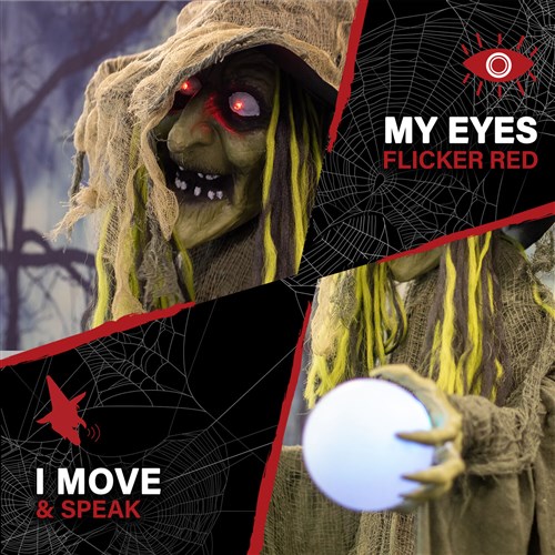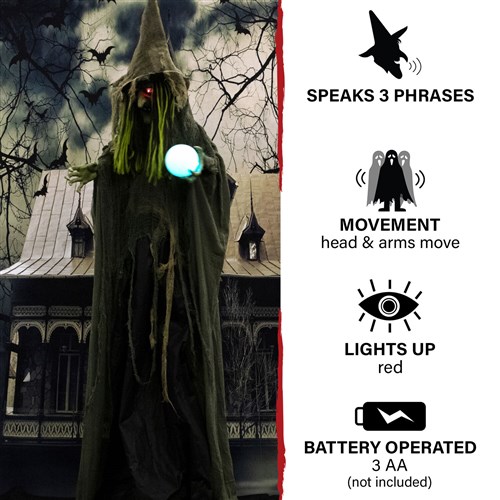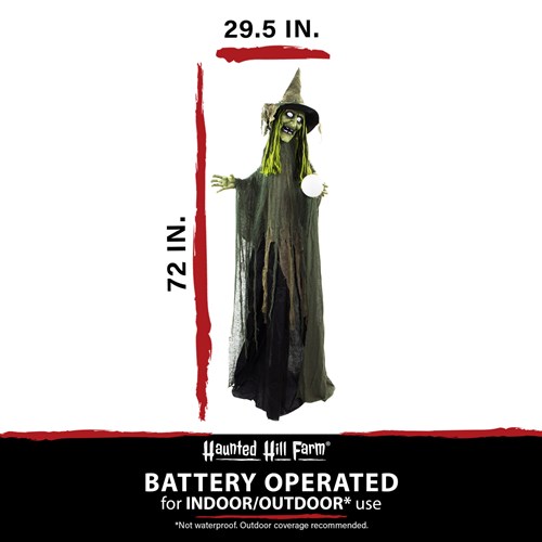 Haunted Hill Farm 72″ Animated Standing Green Witch with Globe Features: