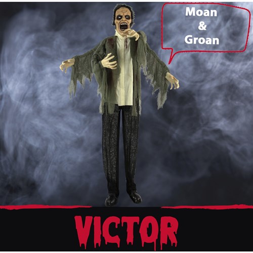 Be afraid. Be very afraid of Haunted Hill’s Lawn of the Dead Series. These blood curdling creatures are sure to terrify any trick-or-treaters, co-workers, or customers. If you see Victor the Zombie coming, it’s time to run the other way. This blood-stained beast is sure to horrify anyone who crosses his path. Victor’s eyes flash multiple colors as he moans and makes eerie noises. His wide open mouth reveals a fearsome set of teeth and an ominous dark interior. His spiky brown hair, tattered jacket, and human hands are menacing. Pose Victor’s bendable arms into a new petrifying position each day to keep visitors on their toes. Whether suspended from his hanging loop or propped on his stand, Victor’s presence cannot go unnoticed. He certainly notices you…