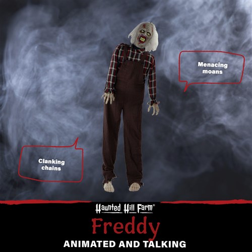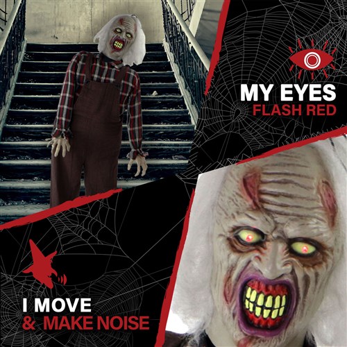 Be afraid. Be very afraid of Haunted Hill’s Lawn of the Dead Series. These blood curdling creatures are sure to terrify any trick-or-treaters, co-workers, or customers. Freddy the Zombie is as fearsome as it gets. This beast has an insatiable appetite, and he’s ready to feast this Halloween. As victims approach, his body rotates on his stand as he surveys his new snacks. His eyes flash red with wicked excitement while he releases menacing moans and clanking chain sounds. Freddy’s most frightening feature is his face. His mouth is stretched wide in a hungry toothy growl, exposing yellowed teeth, thick red gums, and a black interior. His bulging yellow eyes stare with a severity that will shock even the bravest of souls. Graying wrinkled skin envelops his wounded head and gives the zombie a rotting appearance. Suspend him from his included hanging loop or prop him next to your holiday treats to greet unsuspecting guests. Dressed in a plaid button up and overalls, Freddy is ready to get his hands dirty.