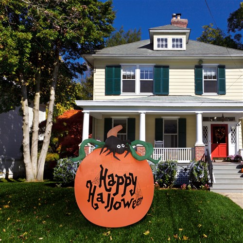 Your neighbors will be in for a fright when they see your 3.2-ft. Inflatable Pumpkin Happy Halloween Sign. This pre-lit inflatable is outfitted with three internal white LED lights and will be the centerpiece of your own personal haunted house. It’s big enough to make the neighbors notice but still works in smaller yards or walkways. It’s the perfect trick to give your trick-or-treaters a scare without giving them nightmares. The treat is how quick and easy it is to set up with included ropes and lawn stakes for secure installation. Thanks to the internal lights and fan, all you need to do is unpack it, plug it in, stake it down, and you’re ready for some scary fun all Fall long. Created out of durable, weather-resistant polyester, you won’t need to worry about holes. Your inflatable will last year after year and scare after scare. With Haunted Hill Farm, you’ll be the scariest house on the block!