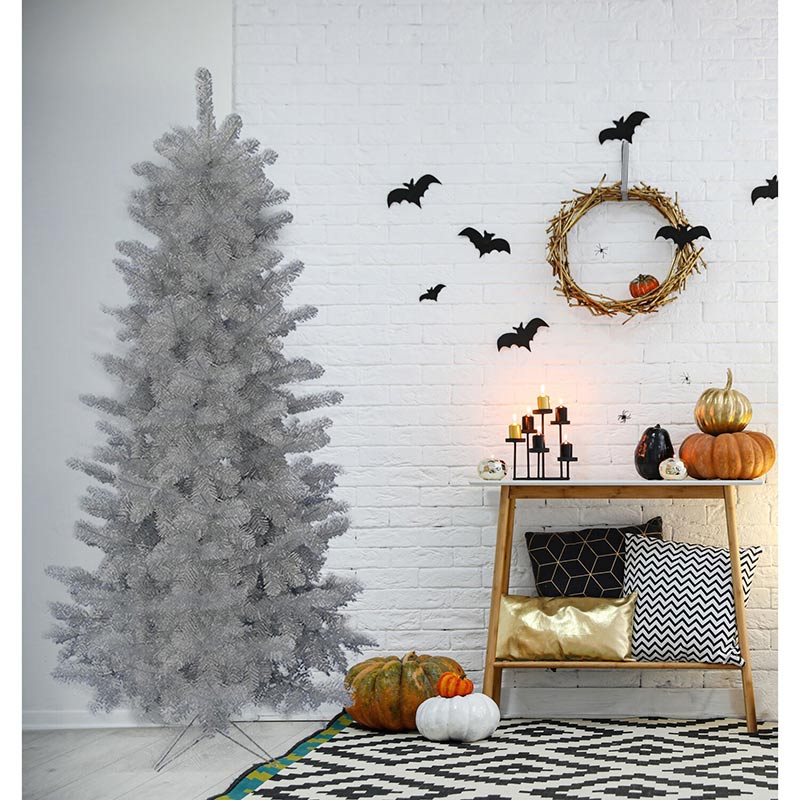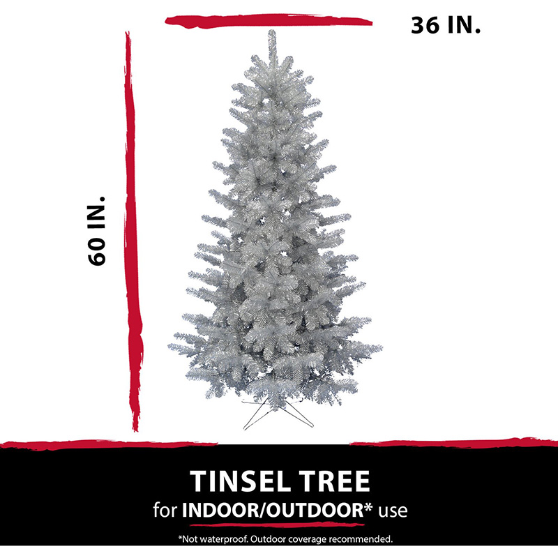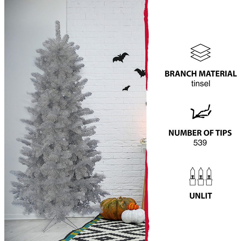 - NOT JUST FOR CHRISTMAS! Shiny silver tinsel puts a playful twist on your Halloween decorating. Our 5-ft. tree will delight your trick or treaters with frightfully fun whimsy!