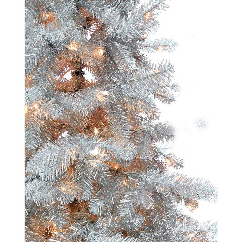 - Sturdy metal branches dressed in shimmering silver tinsel