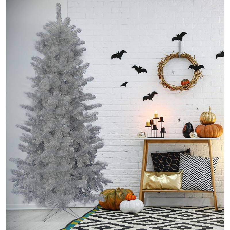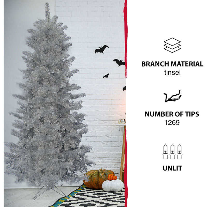- NOT JUST FOR CHRISTMAS! Shiny silver tinsel puts a playful twist on your Halloween decorating. Our 7-ft. tree will delight your trick or treaters with frightfully fun whimsy!