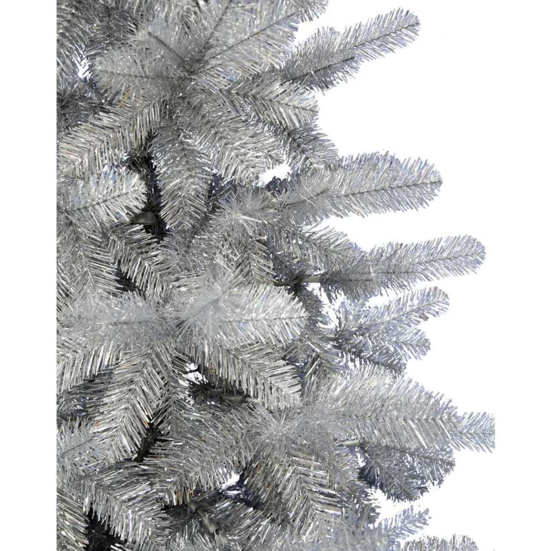 - Sturdy metal branches dressed in shimmering silver tinsel