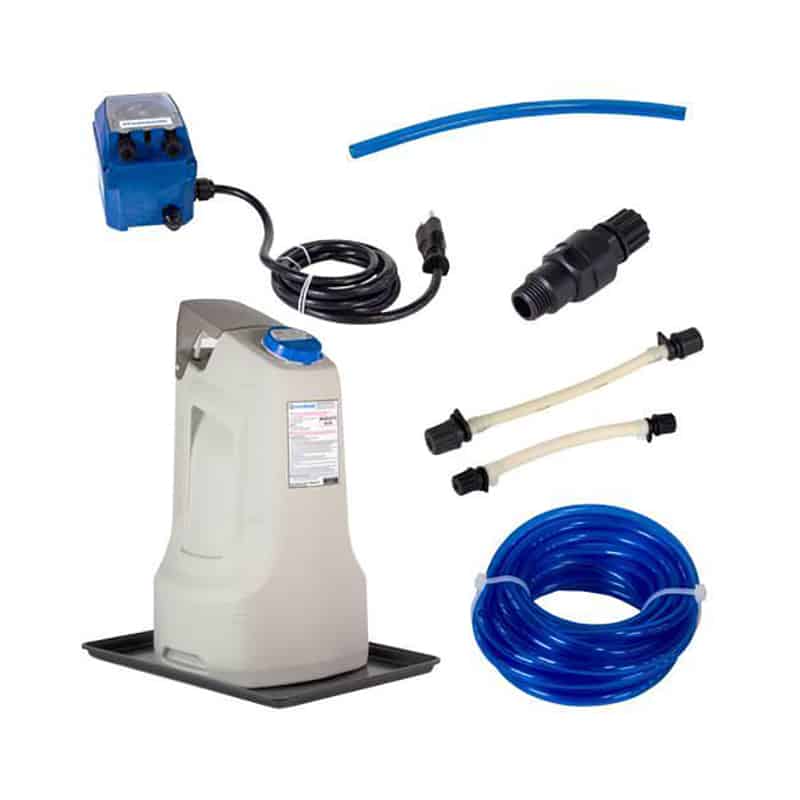 - Large Capacity 15-gallon pump and tank capable of automatically dispensing acid (for pH control) or liquid chlorine (for sanitization)