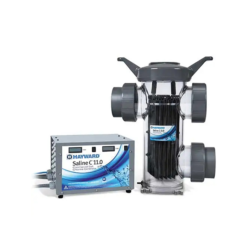 Hayward Saline C Series HCSC110 Salt Chlorine Generator provides an elegant, rugged solution specifically designed to meet the demands of commercial installation. It delivers all the benefits of salt chlorination without the extra cost. This NSF-certified salt chlorinator is capable of producing up to 11 pounds of chlorine per day. Its compact, space-saving design features a single clear vessel paired with a power supply, eliminating the need for daisy-chaining multiple cells. This more-efficient design lowers installation costs and consumes less space.