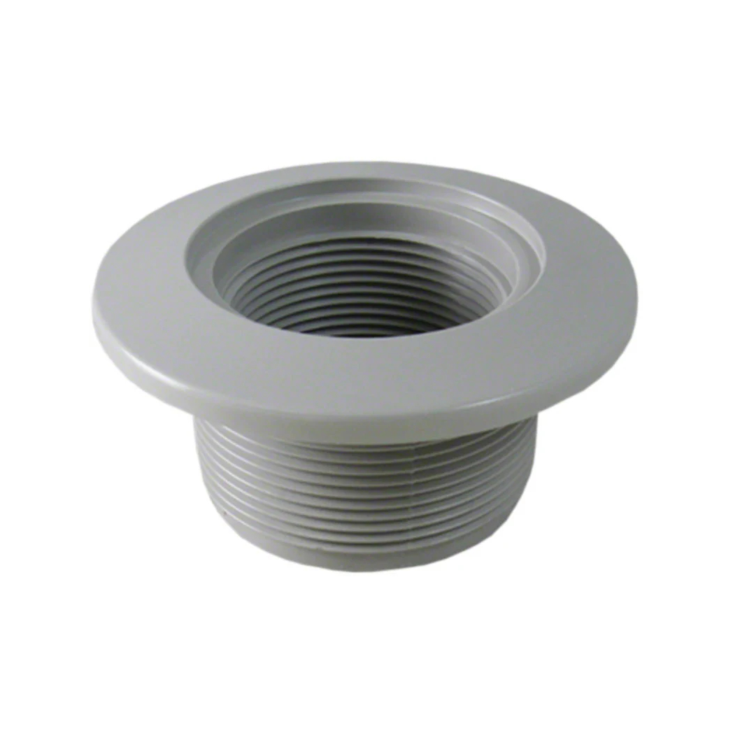 The Hayward Vinyl Wall Return Fitting and Vac receptacle, 1-1/2 inch FIP threaded x 2 inch MIP threaded, in the color gray. This return wall fitting is for use in vinyl liner pools and is threaded on both ends. It can be used as a vacuum fitting or receptacle for any 1-1/2 inch MIP directional flow inlet fitting. If used as the directional flow inlet fitting, the material for both fittings (wall and directional) must be the same.