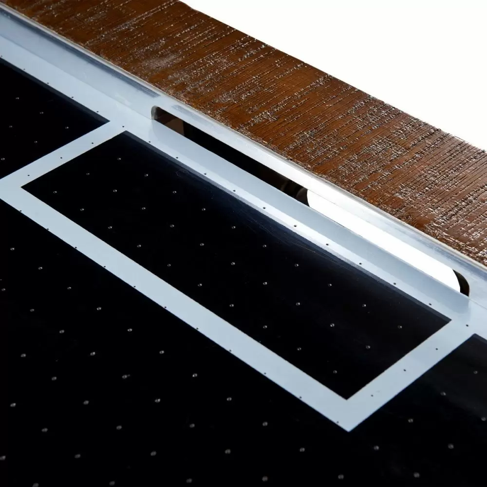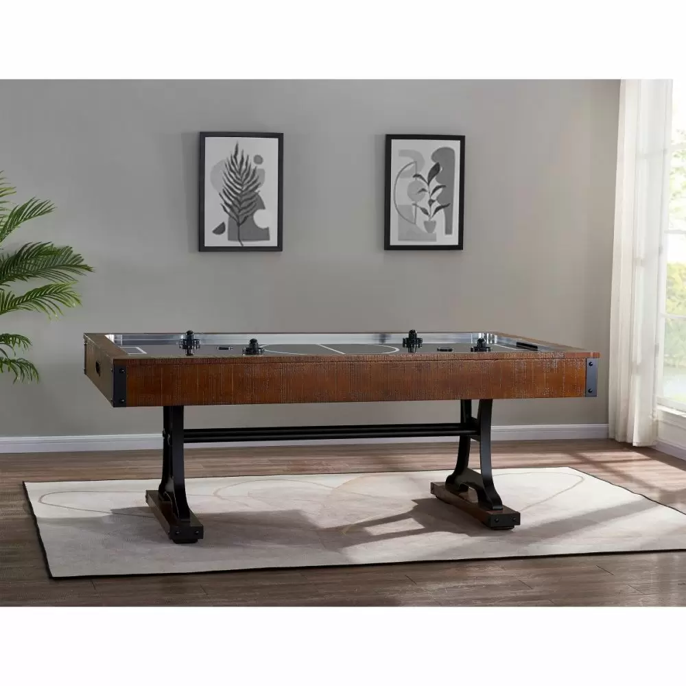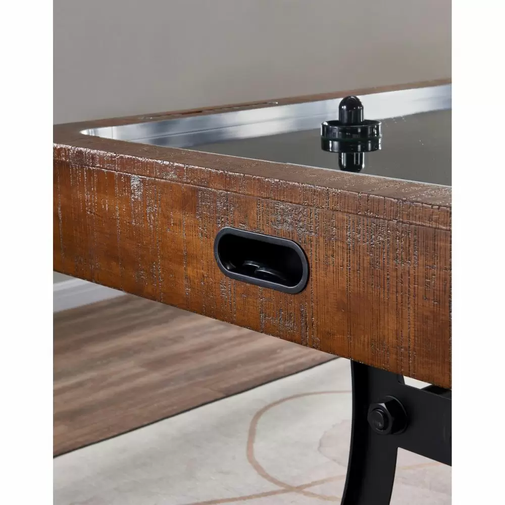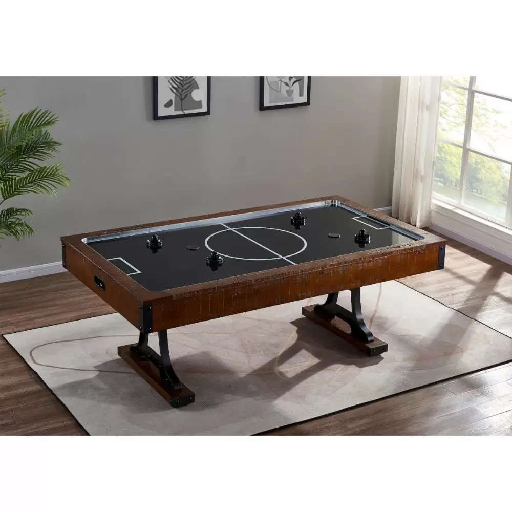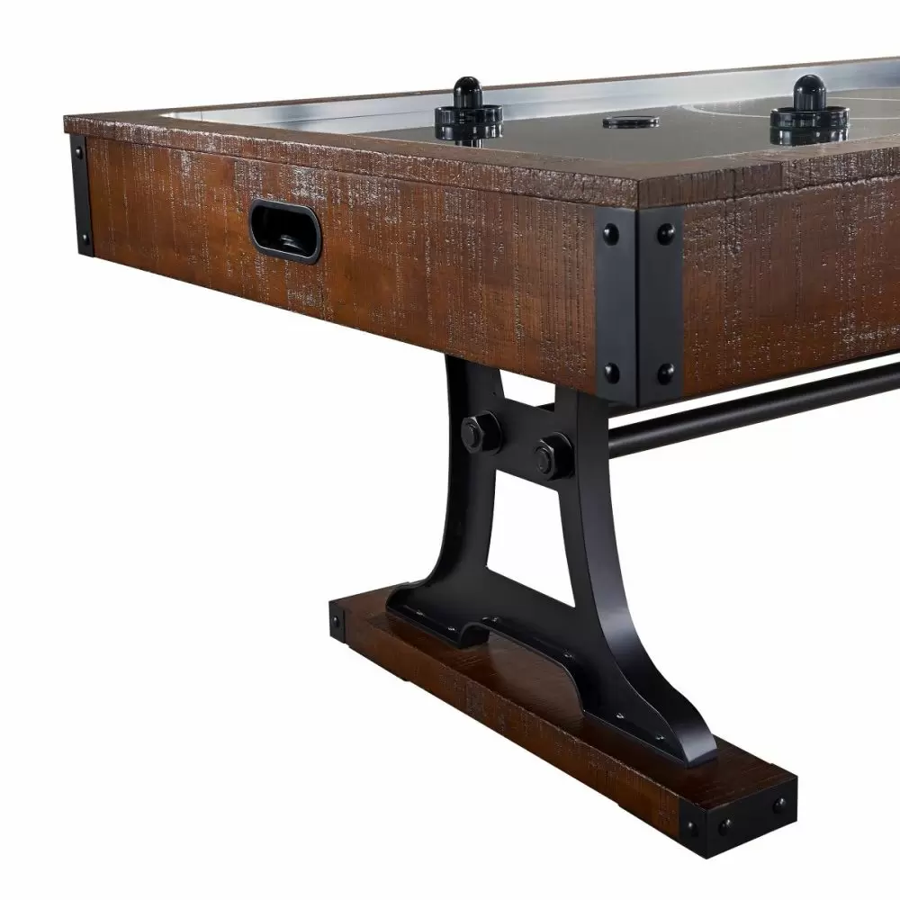 The Industrial Air Hockey Table combines smooth air hockey gameplay with modern industrial style. The table features a rustic brown finish that adds a unique element to any room décor. Distinct metal pedestal legs and crossbars add both support and style to the game’s distinct design. The table includes 4 pucks, 4 goalies, and 2 manual inset scoring systems as well as adjustable leg levelers and a powerful single fan for optimized gameplay.