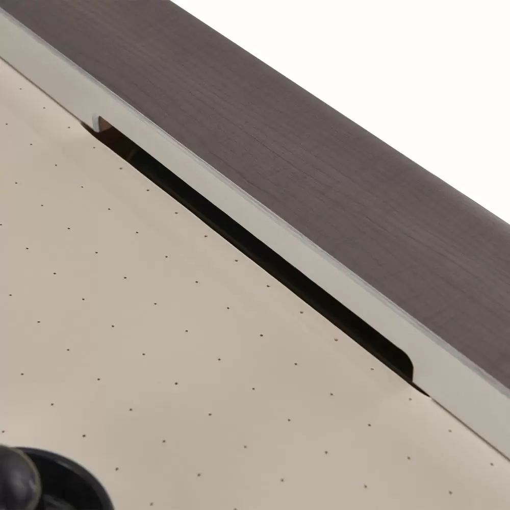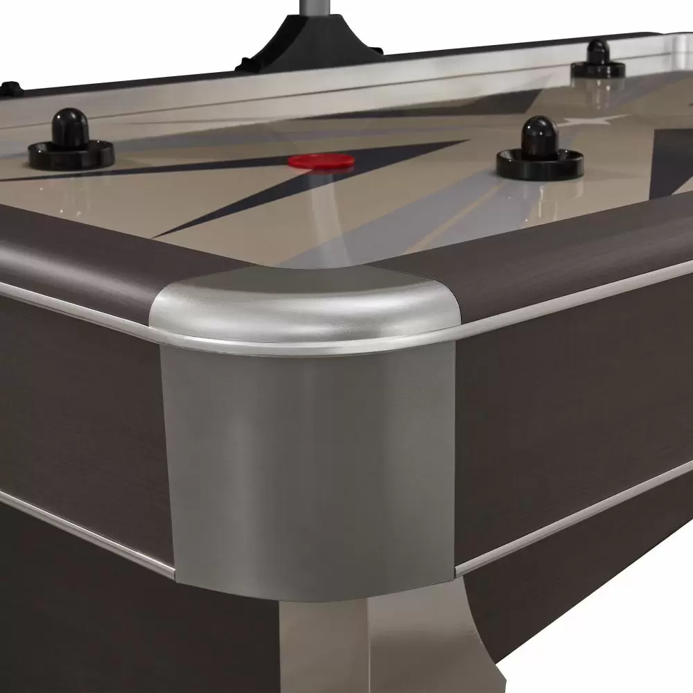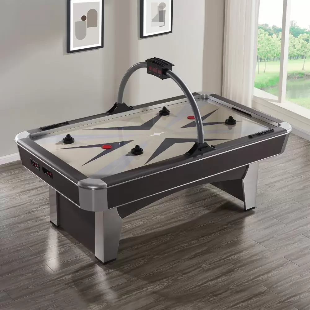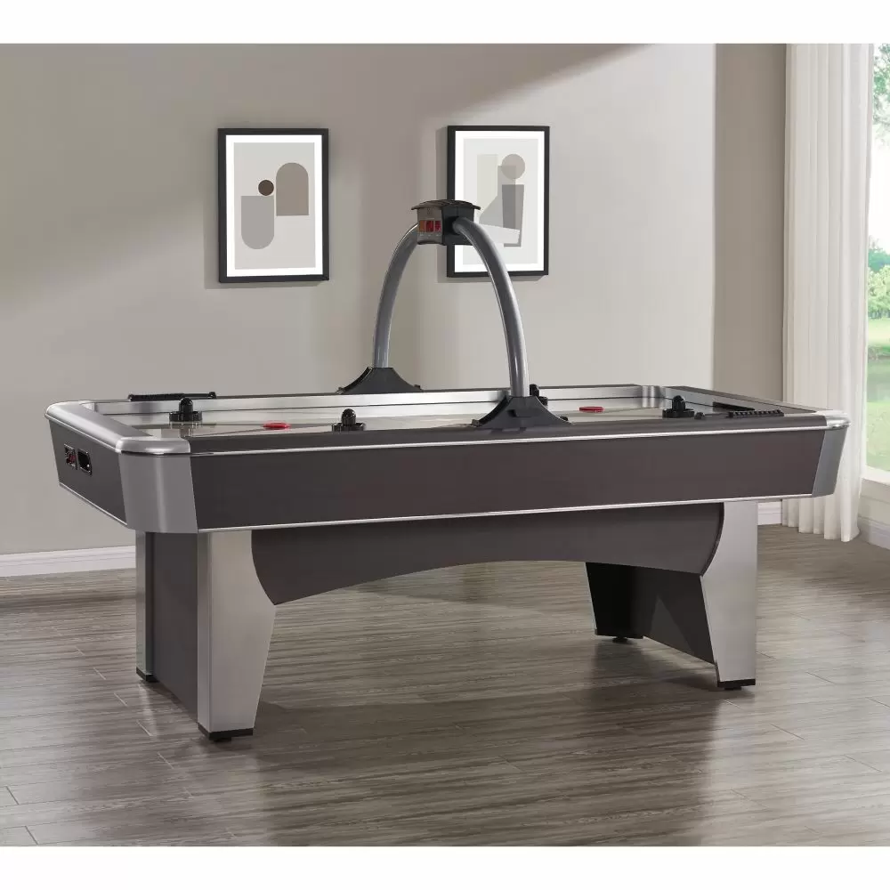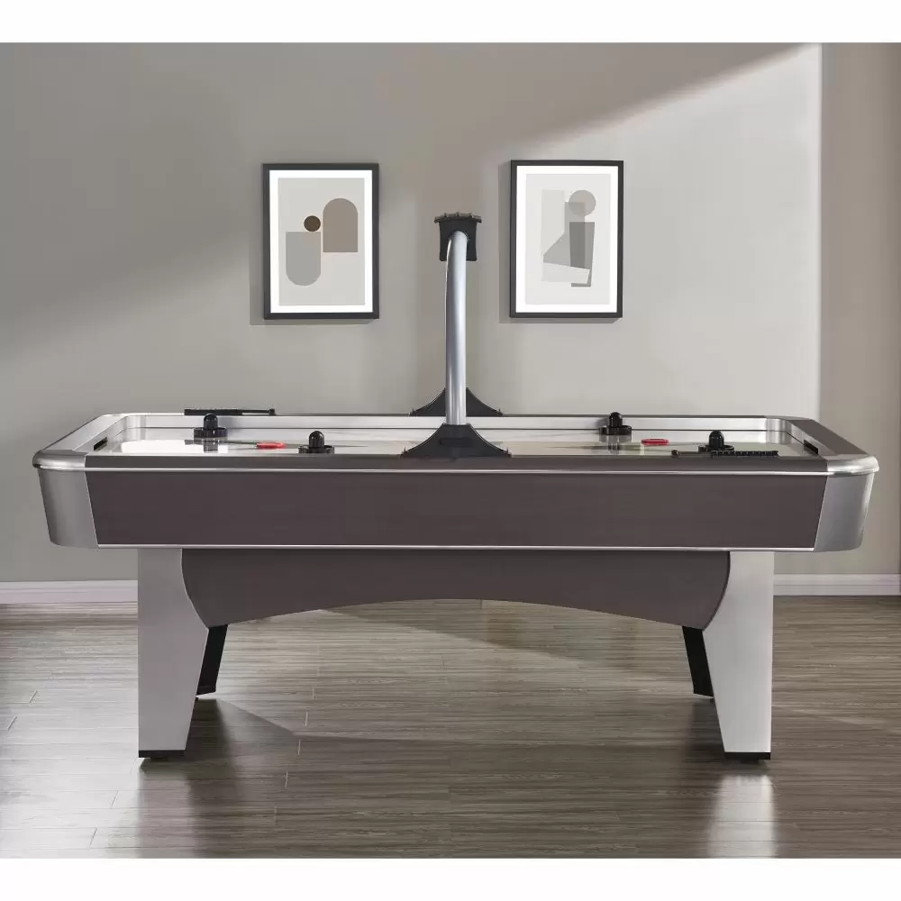 The HB Home Jensen Air Hockey Table combines smooth air hockey gameplay with sleek modern style. The table features a beautiful Edgewater finish with silver accents and trim that looks great when paired with any room décor. A two-player electronic scoring system is included on the unique overhead arch. The table includes 4 pucks, 4 goalies, 2 additional manual inset scoring systems, and a powerful single fan for optimized gameplay.