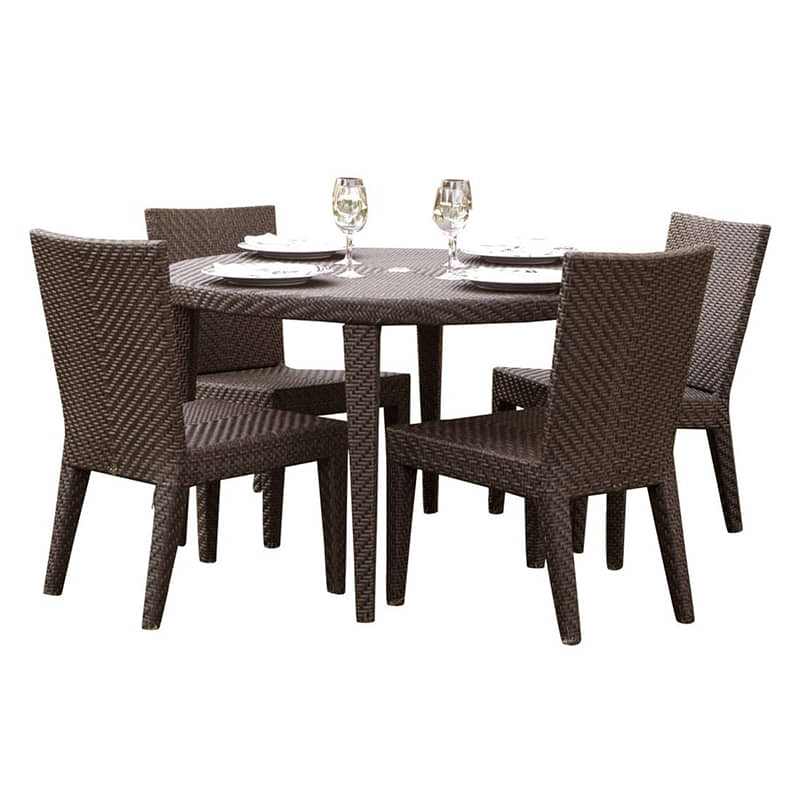 When you want your outdoor patio to have a sleek and modern look while still maintaining a high level of comfort, The Soho Collection exceeds your expectations. This collection offers contemporary, high quality outdoor furniture for your home. The 5 Piece Dining Set offers a fully anodized aluminum frame, which is then woven with Rehau Java Brown fiber. It includes 4 sidechairs and a 47″ round table. The cushions are available in a high quality Sunbrella fabric in a variety of colors and patterns to match your outdoor decor. The round table has a thin sheet of Plexiglas underneath the woven fiber making it stronger and durable and eliminating the need for a glass. Its unique look and multi-colored textured surface make it one of the most attractive collections for outdoor use. The Soho Collection gives you the freedom to create your own sectional and become the envy of your neighbors.