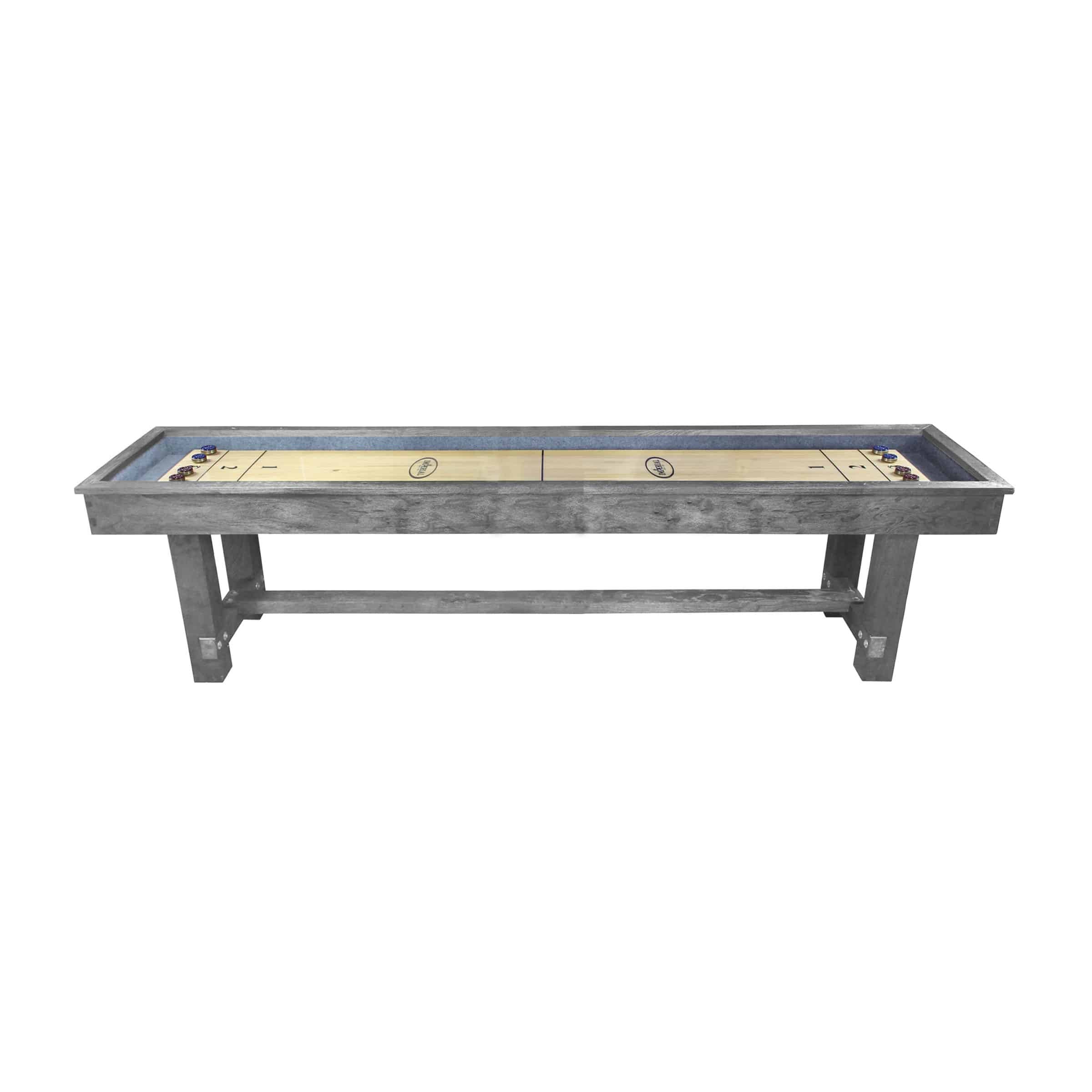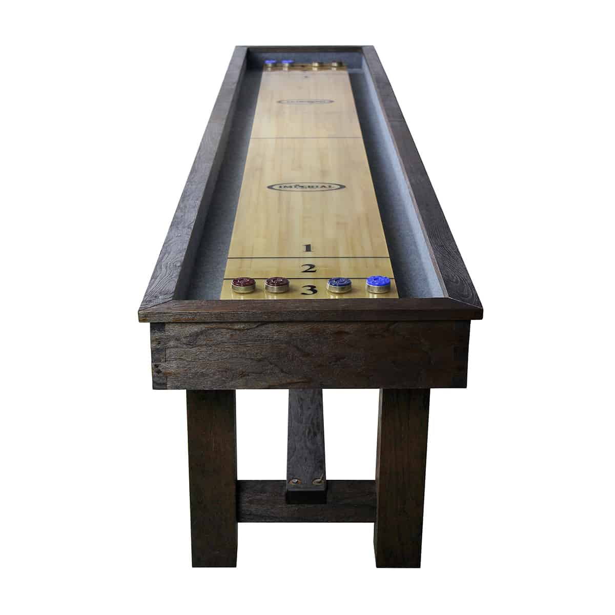 The Imperial 9 Ft Reno Shuffleboard Table is an authentic, pub-style table available in 9 or 12-foot versions. Made of solid Aspen wood with an Elm veneer, the Reno Shuffleboard is finished in a beautiful rustic Weathered Dark Chestnut or Silvermist. The table’s solid wood playing surface provides great puck slide and is coated in a protective polymer that ensures years of fun for the entire family. Solid wood post legs with crossbeams give the table a unique look while adding extra stability. The Reno Shuffleboard includes 4 red and 4 blue shuffle pucks, two scoring markers, a can of powder, and a playfield brush.