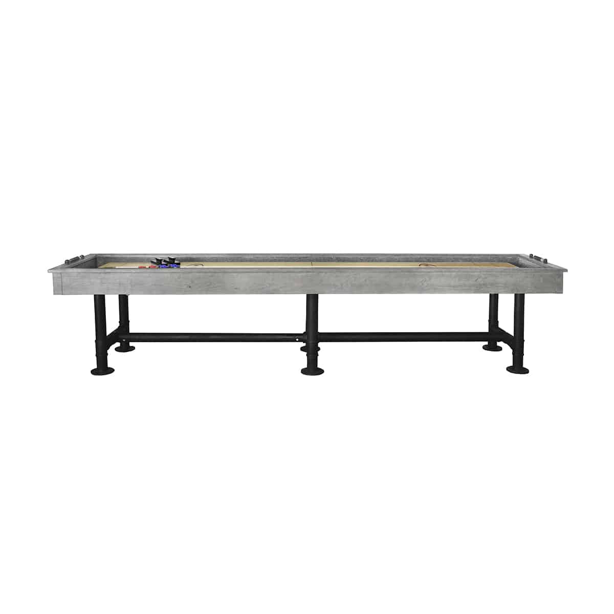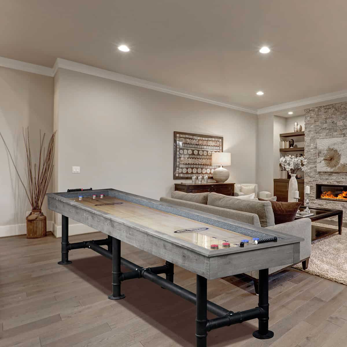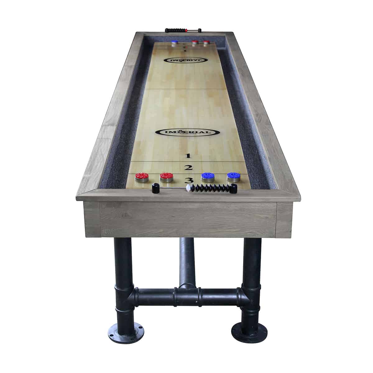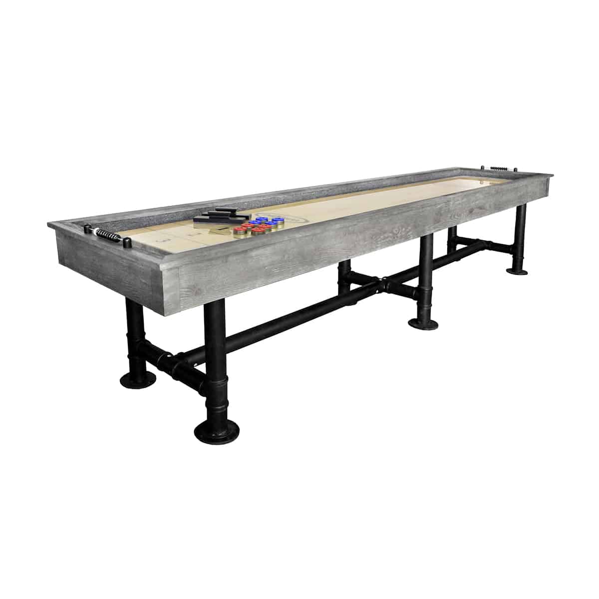 The Bedford 12-foot Shuffleboard Table is will provide years of fun and enjoyment for the entire family. The cabinet is made of 1-2/5 inch thick solid Douglas fir with a Silver Mist finish. The playfield is made of solid Aspen wood with a 1/8-inch polymer seal and measures 128L x 20″W x 3″ Thick. The table has 4 big climatic adjusters for maximum play. Three sets of steel legs with a steel crossbar provide exceptional stability. Overall game size: 145″ x 33″ x 32″. Includes eight pucks (two colors), 1 table brush, 1 can of speed wax, and 2 sets of scoring units.