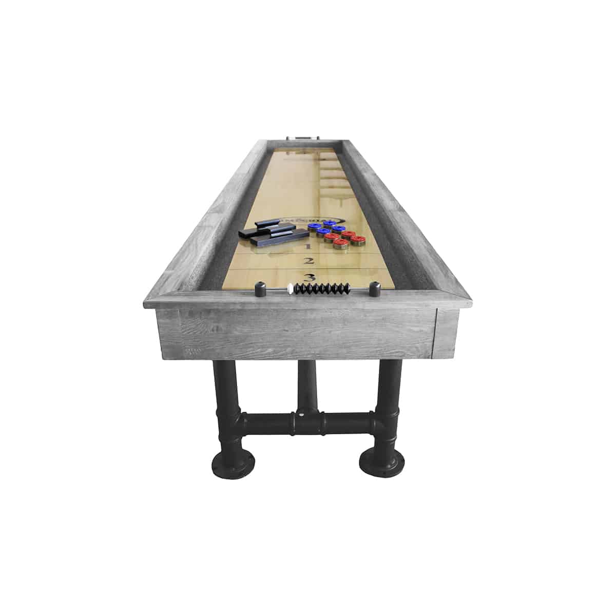 The Bedford 12-foot Shuffleboard Table is will provide years of fun and enjoyment for the entire family. The cabinet is made of 1-2/5 inch thick solid Douglas fir with a Silver Mist finish. The playfield is made of solid Aspen wood with a 1/8-inch polymer seal and measures 128L x 20″W x 3″ Thick. The table has 4 big climatic adjusters for maximum play. Three sets of steel legs with a steel crossbar provide exceptional stability. Overall game size: 145″ x 33″ x 32″. Includes eight pucks (two colors), 1 table brush, 1 can of speed wax, and 2 sets of scoring units.