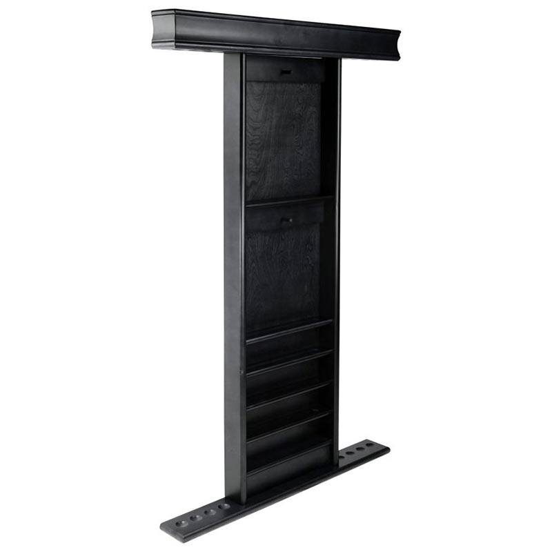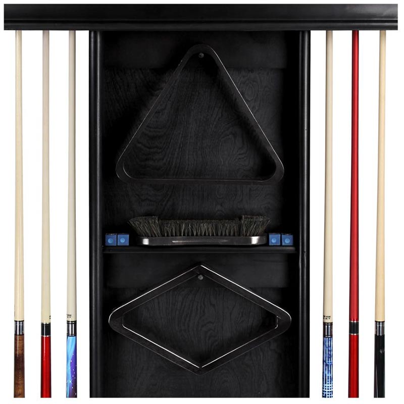 This Deluxe Wall Rack is a beautifully designed, solid wood wall rack in a Black finish. This rack holds 8 cues, a set of balls, triangle, and a 9-ball rack. Measures 35.5-inches wide x 58-inches high x 4.5-inches deep. Hardware included. Assembly required.