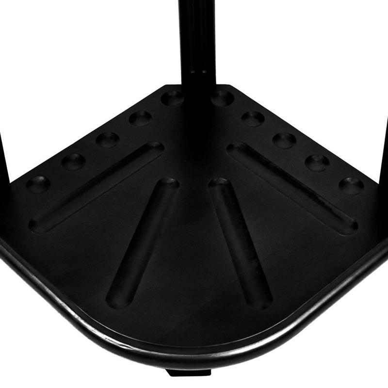 Solid wood corner cue rack with double thick design and a black finish. The top of the rack has slots to hold the triangle and 9 ball rack. Measures 15″ x 15″ x 28″ high. Holds a set of balls and 10 cues. Unassembled.